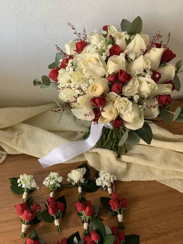 Una fusión de ternura y carácter en un diseño floral elegante y lleno de contrastes. El Bouquet Dafne destaca por su armonía entre el blanco y el rojo, reflejando amor y pureza en igual medida. Su forma redonda y detalles delicados lo convierten en el aliado ideal para una novia que busca un estilo romántico y con presencia.