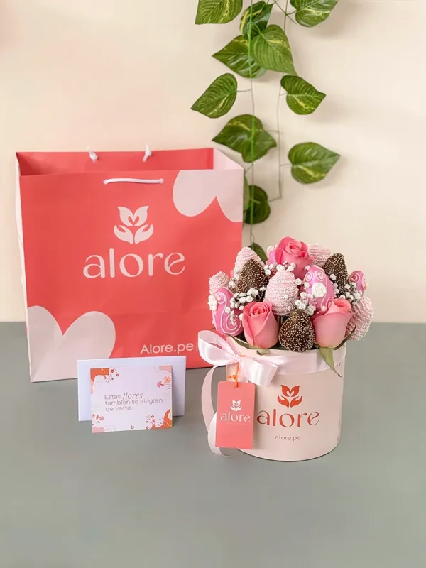 El Box Chocofresas Baby es un detalle delicado y tierno, perfecto para dar la bienvenida a un nuevo nacimiento o sorprender en ocasiones especiales. Contiene 5 rosas rosadas y 12 fresas bañadas en chocolate blanco y bitter con toppings decorativos. Presentado en una elegante caja beige de 15 x 15 cm con lazo satinado rosado y bolsa de regalo, este arreglo es sinónimo de dulzura y encanto.