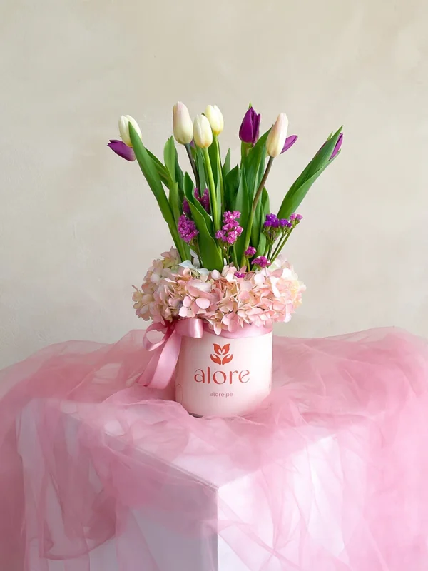 Este arreglo está elaborado con flores frescas, presentadas en un box moderno que realza su belleza natural.