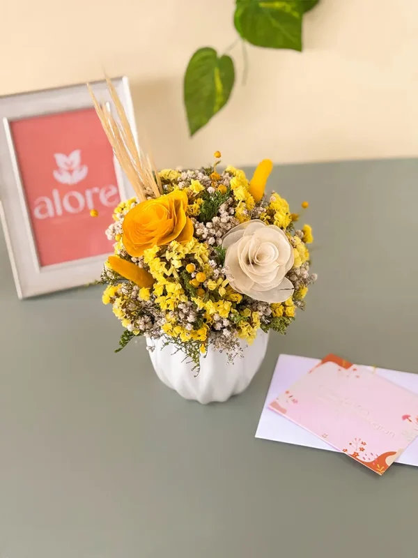 La Maceta Florencia es un detalle pequeño, pero lleno de encanto y luz. Su combinación de flores secas en tonos amarillo, blanco y verde transmite alegría, frescura y armonía, ideal para regalar o decorar con delicadeza.