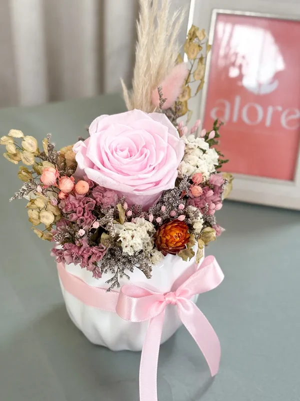 La Maceta Fiori es un detalle de belleza eterna, diseñado para decorar y dar vida a cualquier espacio de forma duradera. En el corazón de este arreglo se encuentra una delicada rosa rosada preservada, capturada en su máximo esplendor para que su encanto perdure en el tiempo. Rodeada por una cuidada selección de flores secas como statice, linaza y jaspia, esta composición ofrece una textura rica y un estilo bohemio-chic.