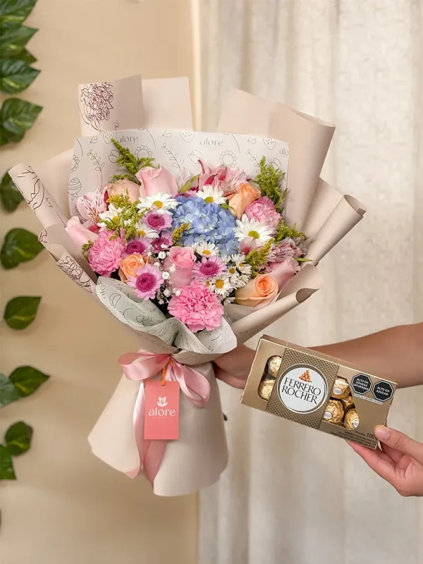 El Ramo Alexandra es una composición sofisticada que equilibra la ternura y la elegancia en una sinfonía de color y textura. Diez rosas en suaves tonos melón y rosado se entrelazan con el azul intenso de una hortensia, creando un contraste visual inolvidable. Este arreglo es el gesto perfecto para expresar un afecto profundo y refinado, complementado con la dulce sorpresa de chocolates Ferrero Rocher. Todo va delicadamente envuelto en papel coreano impermeable, que realza su belleza y frescura.