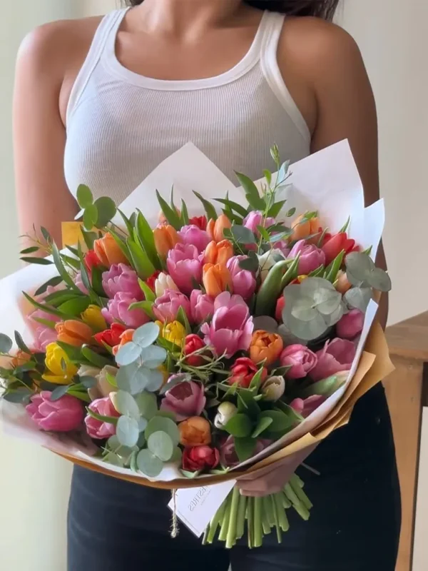 Un despliegue de color, lujo y sofisticación. El Ramo Ginebra está compuesto por 100 tulipanes frescos en tonos variados que crean una explosión visual encantadora. Su presentación envolvente en papel crema y lazo decorativo realza su elegancia, convirtiéndolo en el detalle ideal para celebraciones importantes o declaraciones memorables.